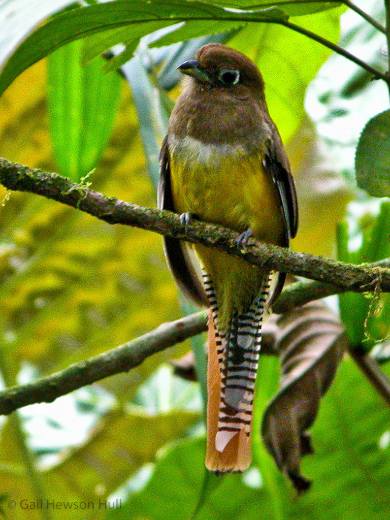 Once I saw a Gartered Trogon eating cecropia fruits. Trogons also feed on palm and other fruits which they pluck while hovering. Trogons have finely serrated bills which allow them to hunt and hold on to large insects, lizards and even small snakes. My mother, uncle and I, while visiting San Gerardo de Dota in Costa Rica’s mountains, were astounded when we saw a male Resplendent Quetzal (the most spectacular member of the trogon family) land near us on the ground in a grassy area, catch a snake, start to fly away, drop the wriggling snake, go back, pick it up, and fly away with it. We stared at each other in disbelief! It’s important to remember all those moments, when chance smiles upon you in a fine form of feathers.