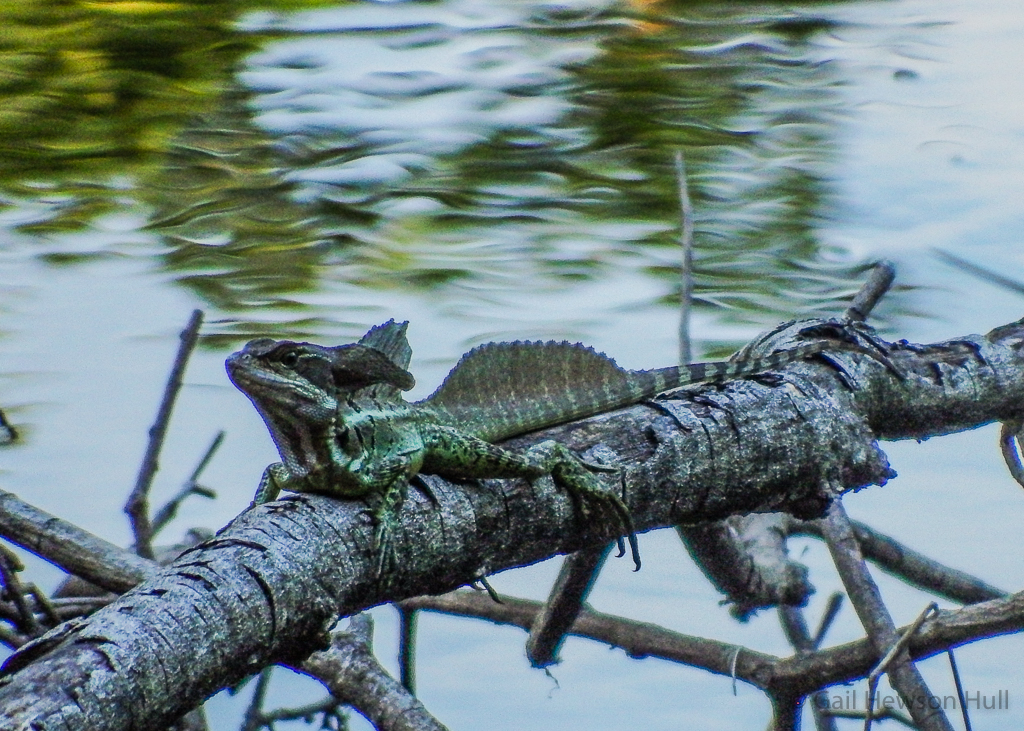 The ability to run bipedally across water at a speedy clip anoints the Common Basilisk (Basiliscus basiliscus) with this special “Jesus Christ” moniker and makes it probably Costa Rica’s most famous lizard. The hind feet are equipped with adaptive flaps of skin that line the toes, allowing juveniles to skip across up to 20 meters of open water. (See National Geographic video below.) Larger, heavier males have the energy to run only a few meters; and if necessary, all Common Basilisks can resort to swimming and do it well. They apparently avoid swimming unnecessarily to avoid aquatic predators. When I walk on our lakeside trail at Finca Cantaros, loud splashing sometimes startles me as the big male races to deep grass cover from his sun-basking post on a fallen tree branch or trunk protruding from the water.