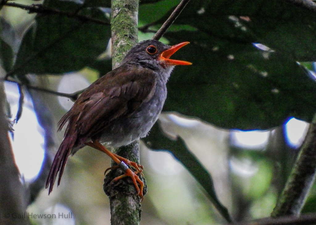 Orange-billed Nightingale-Thrush, foot banded by mist-netters in a decade-long avian population research project in Coto Brus County