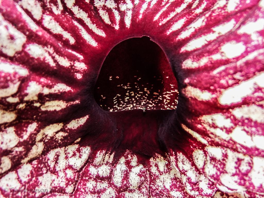 A plant that attracts several species of flies, including the common housefly, must produce some unusual aromas. In fact the odor emanating from essential oils, called geraniol, is quite foul, reminiscent of rotten meat. Notice the colors around the entrance to the flower—dark maroon. Attracted when the flower first opens and its vile smell is at its most potent, the fly, carrying pollen from other flowers, enters the dark passage. Then the fly cannot turn around due to the nature of the trichomes, or hairs, pushing it forward to the utricle where the reproductive organs are. The walls of the utricle produce nectar for the fly to eat while trapped. Once the pollen is delivered to the pistils and stigma, stamen are triggered to produce more pollen which falls on the fly, preparing it for a visit to another flower. There must be some signal that pollination has occurred, because after a period of time the trichome along the passage way decompose, and the fly can then climb out and escape.