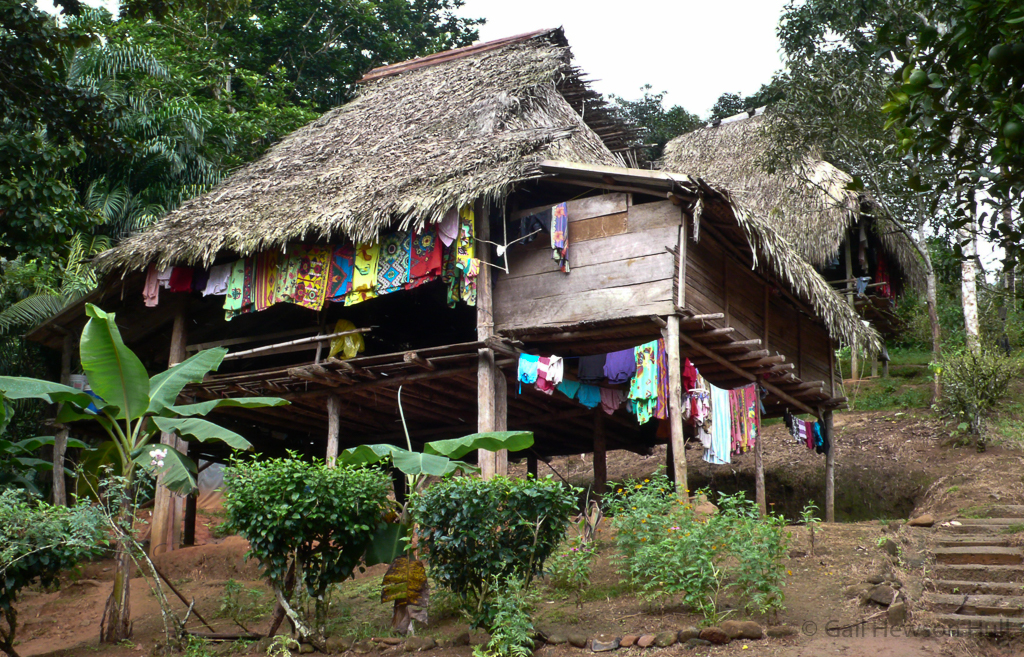 Back to our visit to the Emberá Drua village. About fifty Emberá people moved out of the dangerous Darien Province of Panama in 1975 and formed a new community, Drua, with special dispensation by the Panamanian government to live in the Chagres National Park if they agreed not to cut down forest for agriculture and to hunt only for their own food needs. Their livelihood would become primarily reliant on tourism. The people agreed to these compromises, because they wanted greater access to health care and education for their children, as well as freedom from pressures of Colombian drug traffickers in Darien Province, contiguous to Colombia’s border.