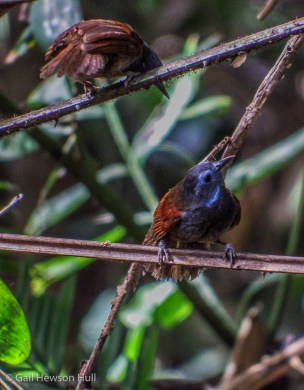In the case of Stachyris erythroptera bicolor, the Chestnut-winged Babbler, a flock of which we encountered in the forests near the Sukau Rainforest Lodge, we were able to observe activity that was completely unfamiliar to us: up to six birds were engaged in what appeared to be a complex activity. Impossible to know for sure which was male, and which female, as I later learned the sexes look very similar. Birds seemed to display and then hide blue skin patches around the throat. In each of three pairs, one individual–probably the male– shook its body vigorously and suddenly darted away, closely followed by the observer to another nearby branch. Activity was going on concurrently by the different pairs within a two square meter area, and all under observation from above by a small gallery of an adult and two juveniles. Those birds were very vocal, as were the performers.