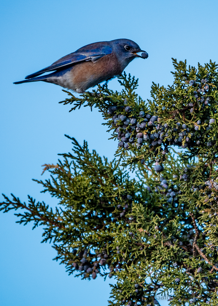 Western Bluebird with Juniper berry on my daily walk in the Zocalo community environs.