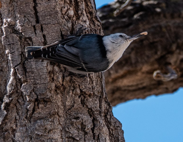 White-breasted Nuthatch with Pinyon Pine nut in Santa Fe’s Randall Davey Audubon Center.