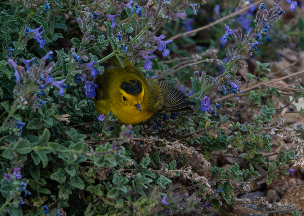 Wilson’s Warbler, male, searching for insects near my front door in the Zocalo community.