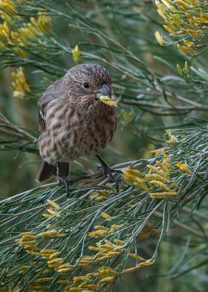 House Finch eating “Chamisa” flowers, aka Ericameria nauseosa, or rubber rabbitbrush.