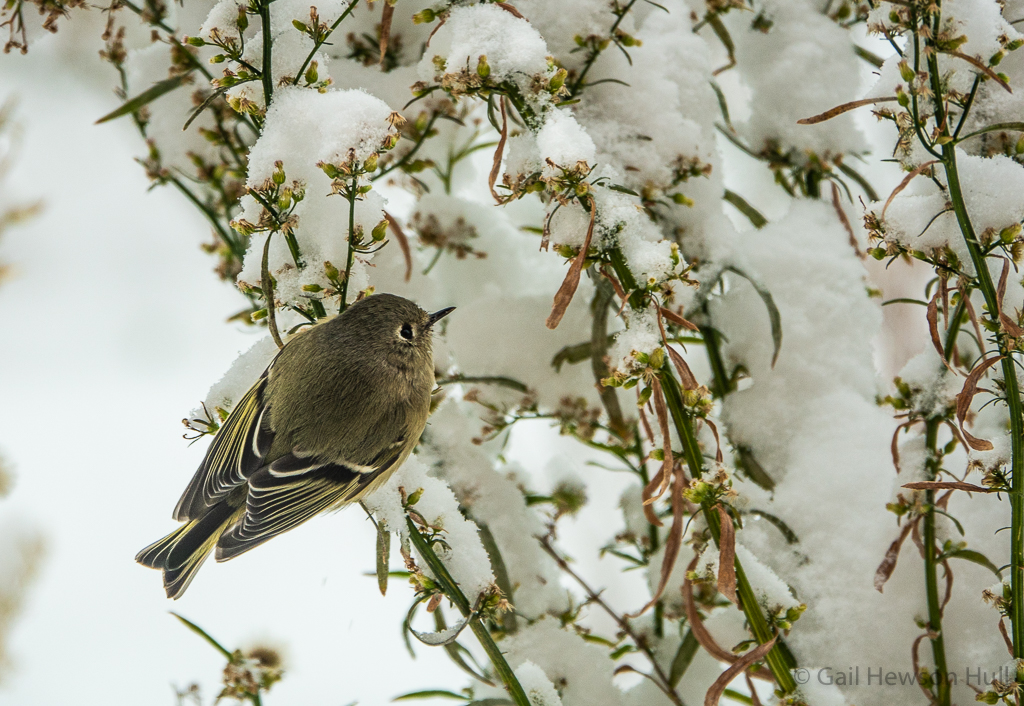 Ruby-crowned Kinglet looking for flowers or seeds outside my window after early September snowfall.