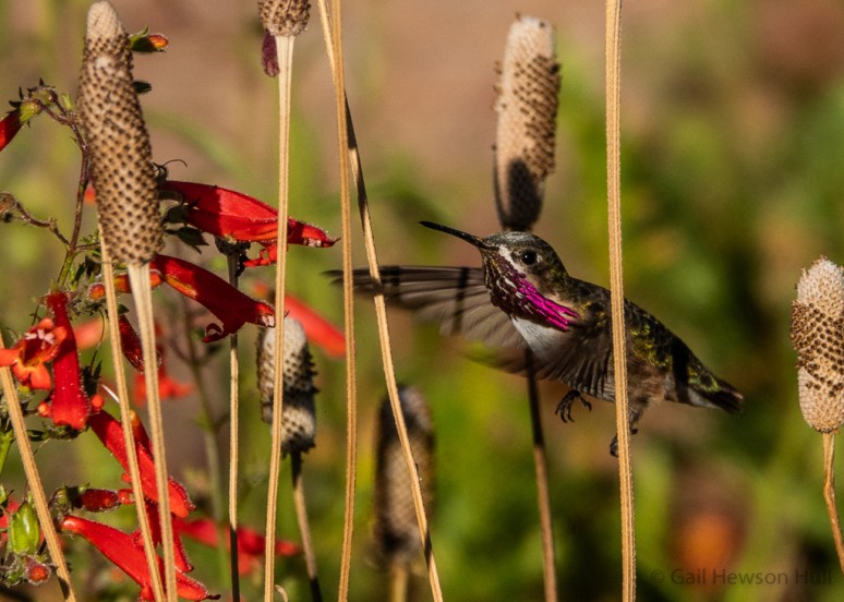 Adult male Calliope Hummingbird with streaked rosy gorget visiting Penstamon sp. flowers in the Zocalo neighborhood.