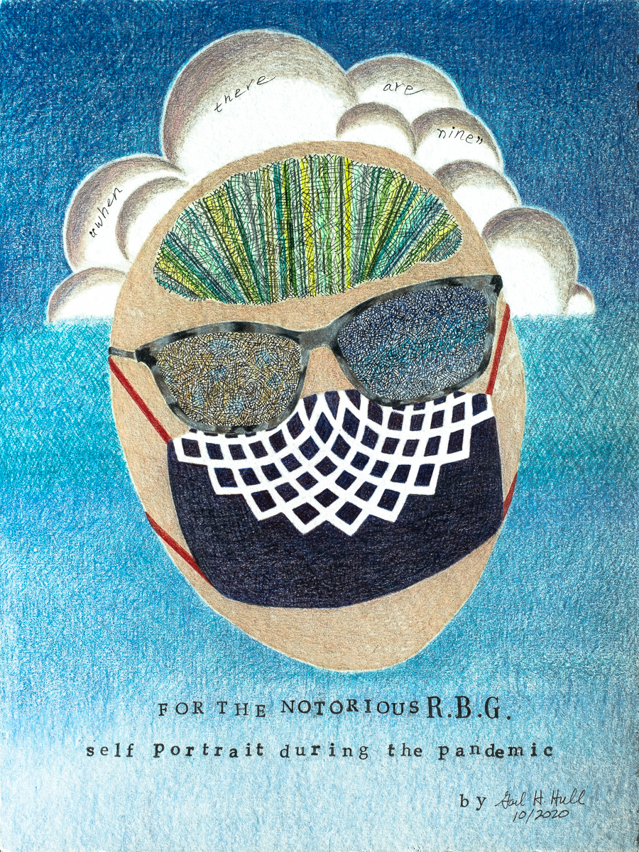 Also below, a colored pencil drawing I did soon after Ruth Bader Ginsberg’s death. It was between my successful cataract operations in September and October, thus–the world’s colors looked different to each of my eyes. I profoundly admired RBG, and she was very much on my mind as I worked on the drawing over several weeks. May she rest in peace.