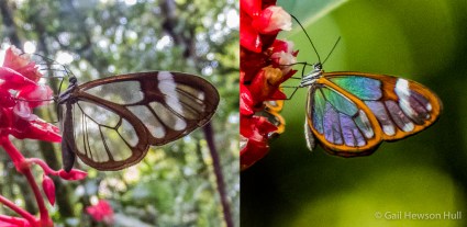 Greta andromica lyra, Nymphalidae (Clearwing). Range: Guatemala to Peru. Same butterfly from different angles.